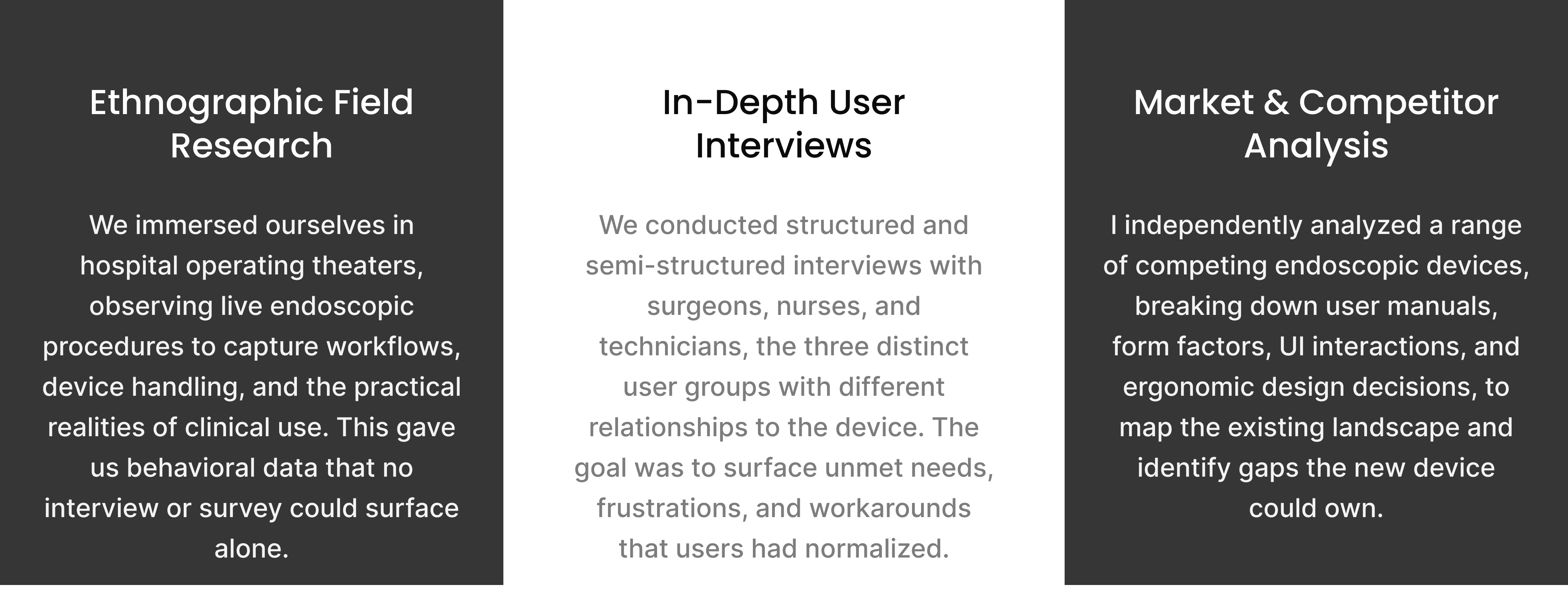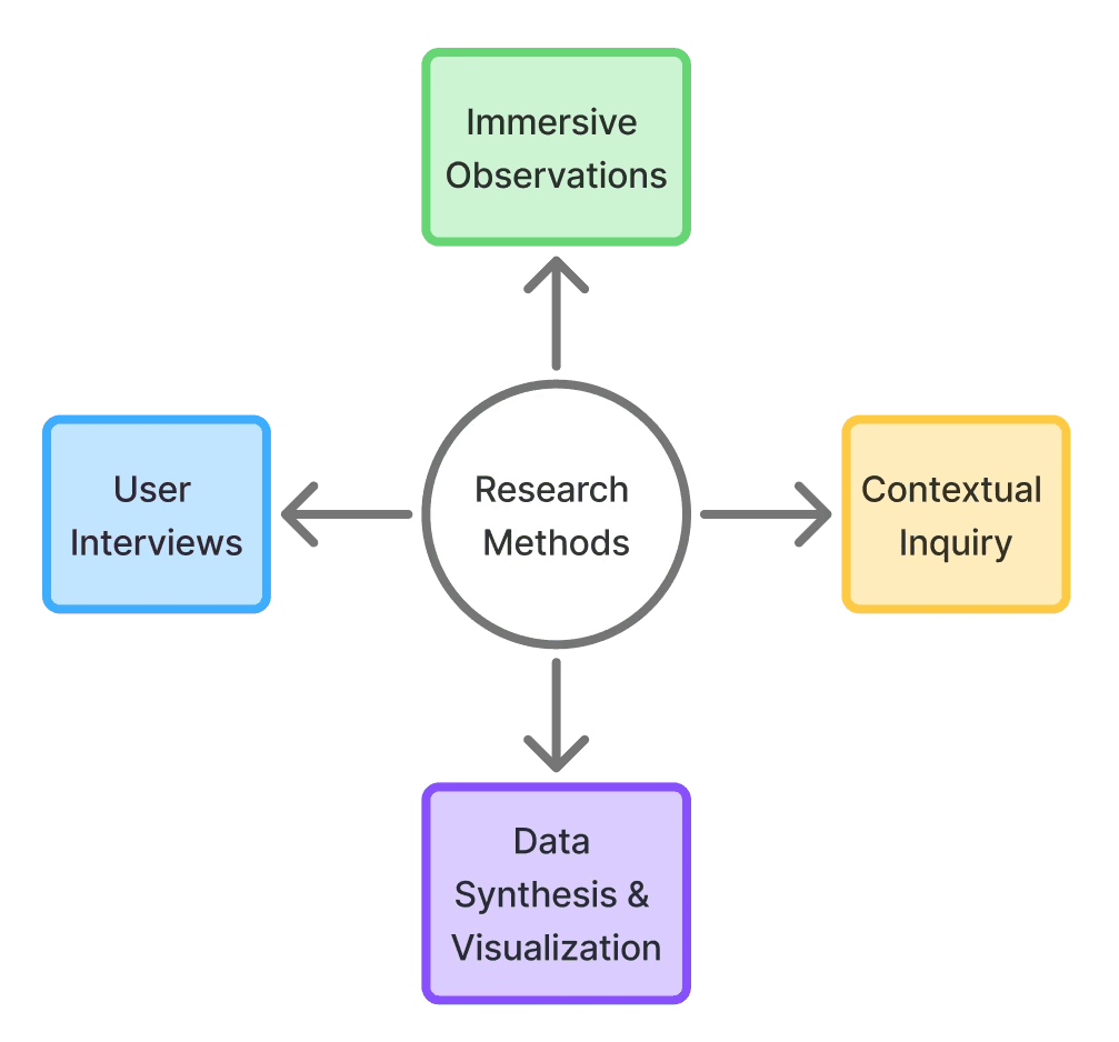 Immersive Observation: attended real-time procedures in operating theaters to observe device use, physical workflows, and pain points as they naturally occurred.