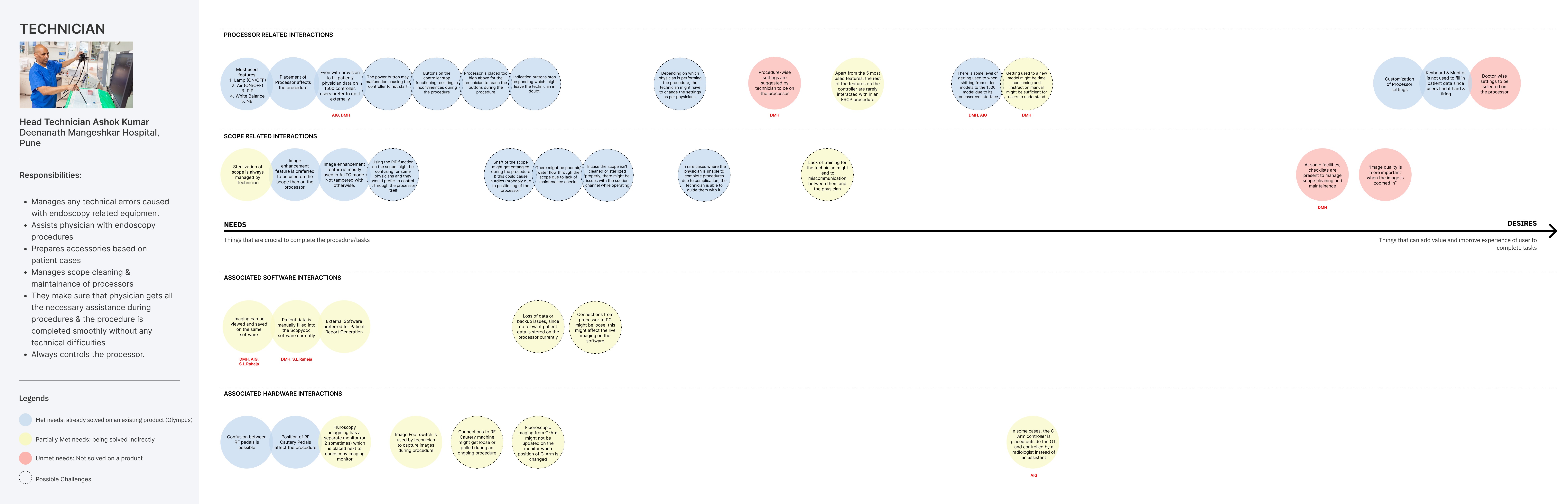 The focus of this project phase was to understand real-life interactions of Technicians and Physicians. For each persona, interactions were divided into four categories: